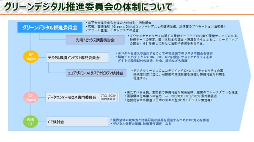 エコデザイン・AIサステナビリティ検討会、データセンター省エネ専門委員会、CE検討会、先端トピックス調査検討会などを傘下に持ち、デジタル技術の環境側面からの活用促進と、標準化対応の両輪で活動しています。